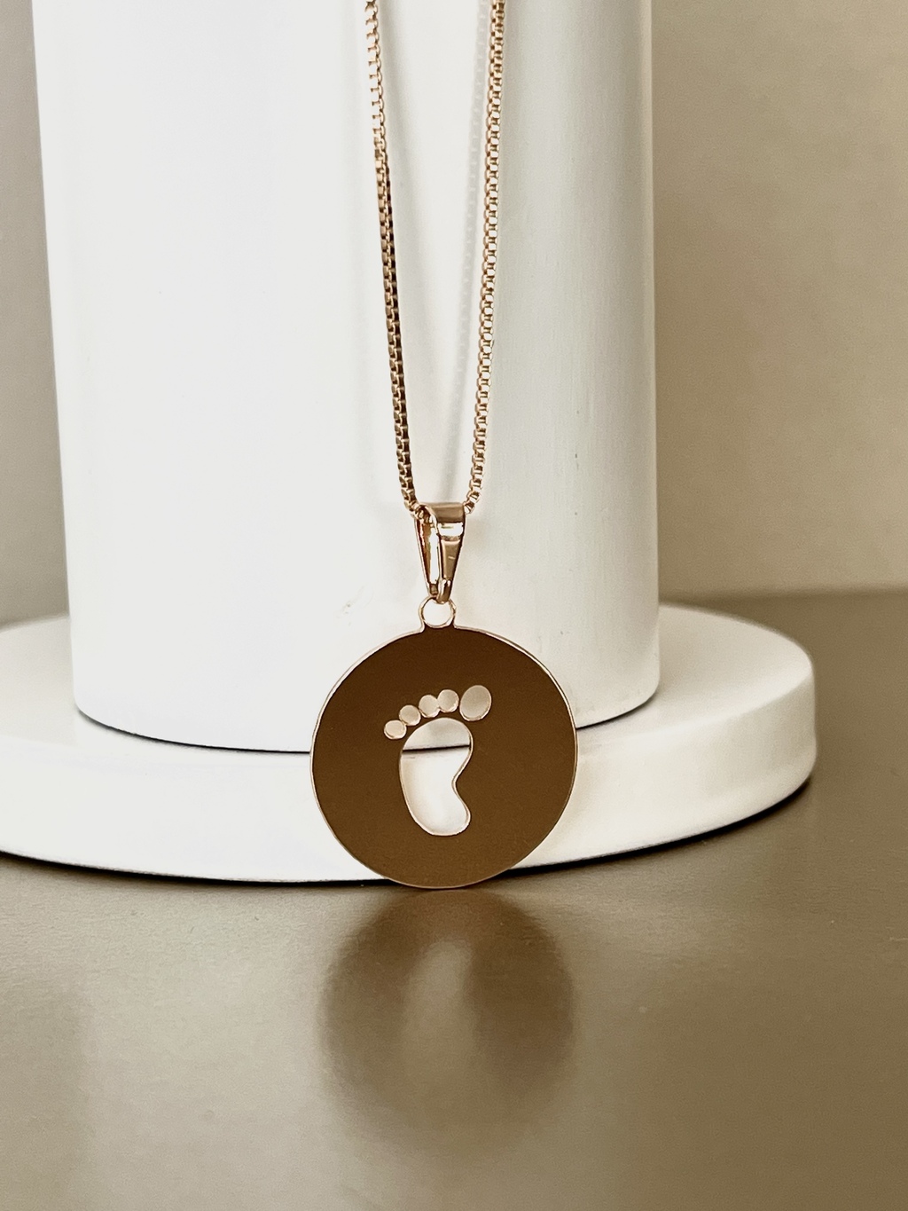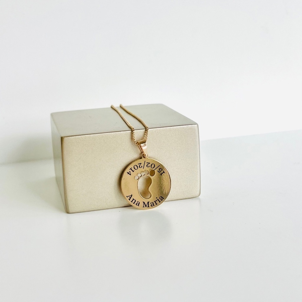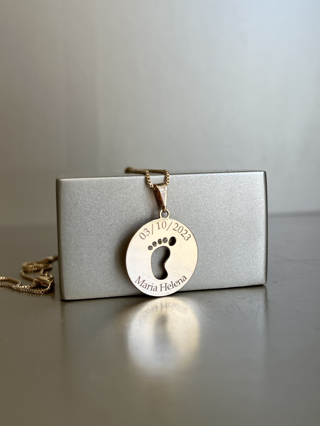 O pingente com o pezinho pode ser personalizado em cima e em baixo do desenho. Medindo 2,0cm X 2,0 cm é uma ótima opção para registrar datas e nomes importantes.