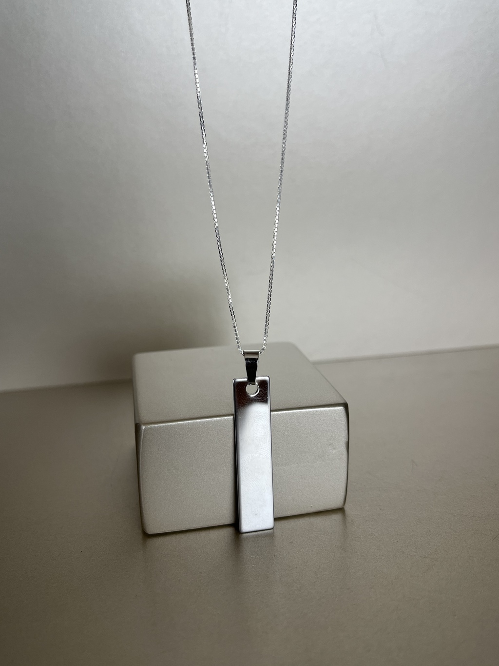 Colar em prata 925 com pingente em aço retangular medindo 1x4cm, podendo ser personalizado na frente foto e verso frase.
